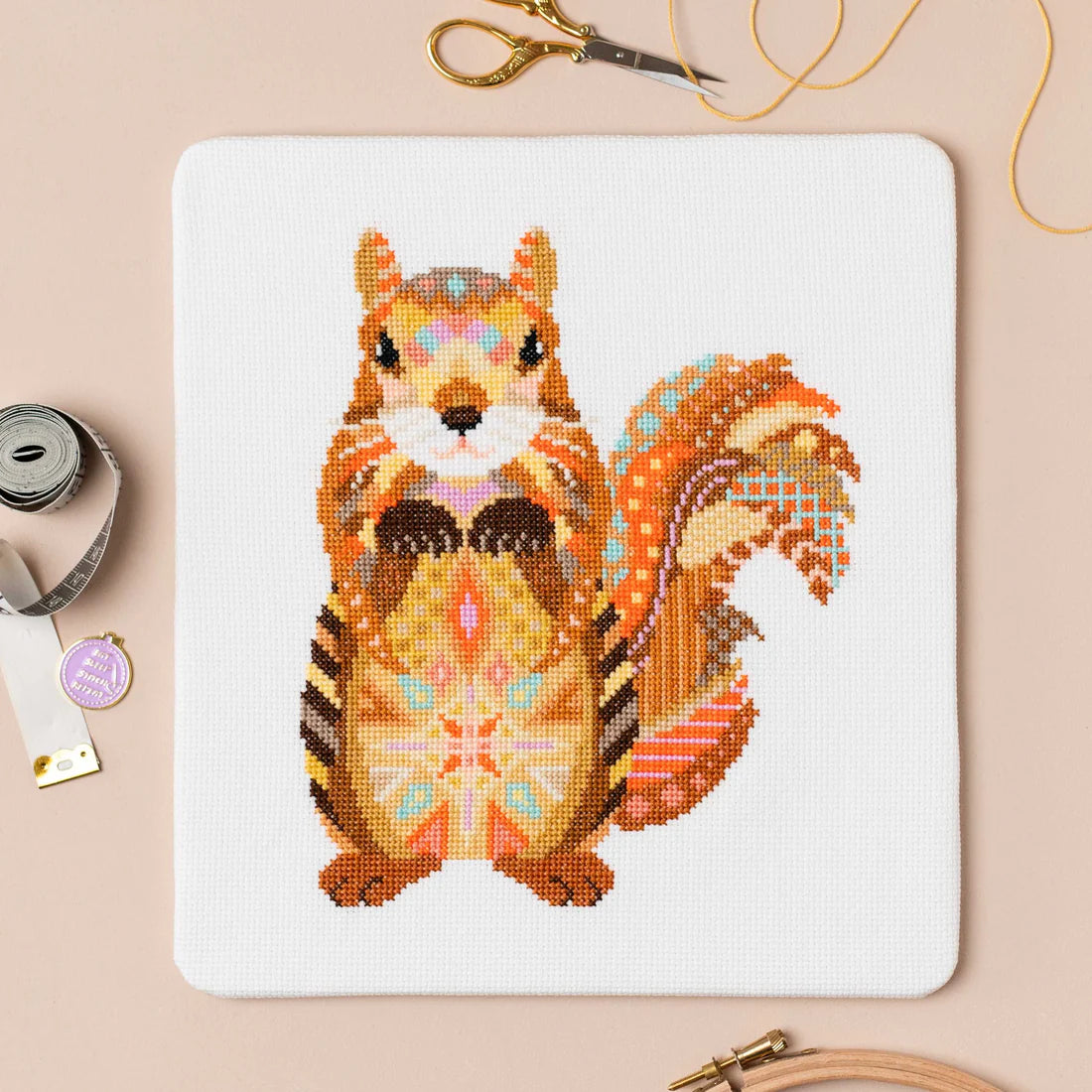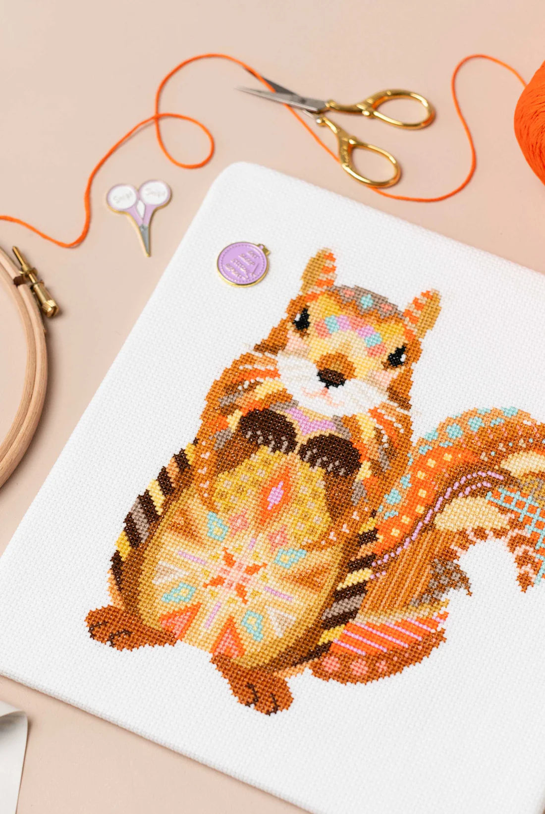 Adorable écureuil à broder, avec de superbes nuances d'orange et de brun, grâce aux couleurs DMC.